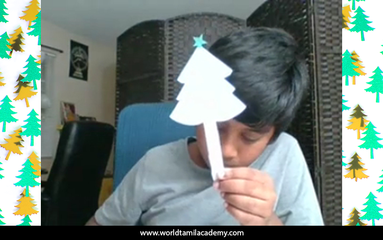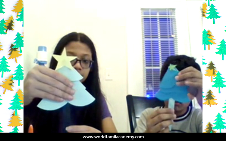 உலகத்தமிழ்க் கலவிக்கழக மாணவர்களுக்கான ஒரு புதிய முயற்சியாகக் காகிதக்கலை பயிற்சி வகுப்பு ஏற்பாடு செய்யப்பட்டிருந்தது. இதில் பங்கேற்க உலகத்தமிழ்க் கலவிக்கழக மாணவர்களில் 20-க்கும் மேற்பட்ட மாணவர்களுக்கு அழைப்பு விடுக்கப்பட்டது. இந்த வகுப்பில் வருகின்ற கிருஸ்துமஸ் தினத்தை முன்னிட்டு மாணவர்கள் தங்கள் வீட்டை அலங்கரிக்கும் விதமாக கிருஸ்துமஸ் மரம் செய்யக் காகிதக் கலைப் பயிற்சி அளிக்கப்பட்டது. அதில் 90 சதவீதத்திற்கும் அதிகமான மாணவர்கள் ஆர்வமுடன் பங்கேற்று தங்களின் சிறப்பான பங்களிப்பின் வாயிலாக காகிதத்தில் கிருஸ்துமஸ் மரம் செய்தனர். அத்துடன் ஒருவருக்கொருவர் தங்களின் கிருஸ்துமஸ் தின நல்வாழ்த்துக்களை சக மாணவர்களுக்கும் ஆசிரியர்களுக்கும் தமிழில் தெரிவித்துக் கொண்டனர். உலகத்தமிழ்க் கல்விக்கழக வழிகாட்டுதலின்படியும் பெற்றோரின் உதவியுடனும் பயிற்சி வகுப்பிற்குத் தேவையான பொருட்களை மாணவர்கள் முன்னேற்பாடுடன் கொண்டு வந்து வகுப்பு சிறப்பாக நடைபெற வைத்தது அடுத்து வரும் புதிய முயற்சிகளுக்கு முன்மாதிரியாக அமைந்தது.